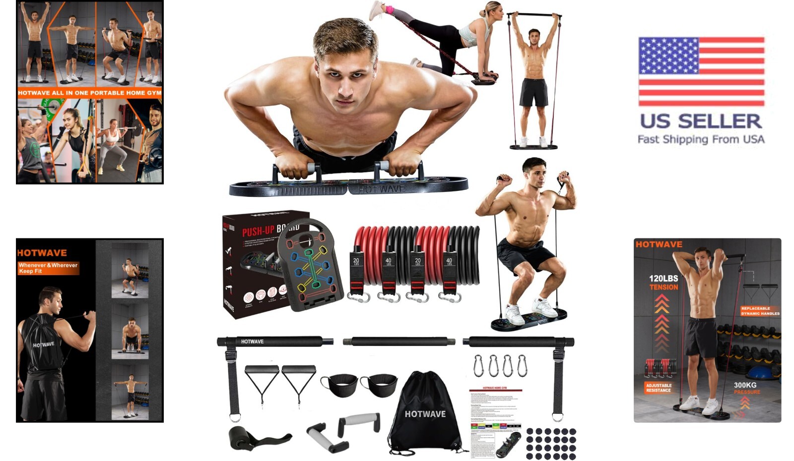 Includes a foldable pushup board, a 3-section bar, 4 resistance bands, 2 ankle straps, and a door anchor.