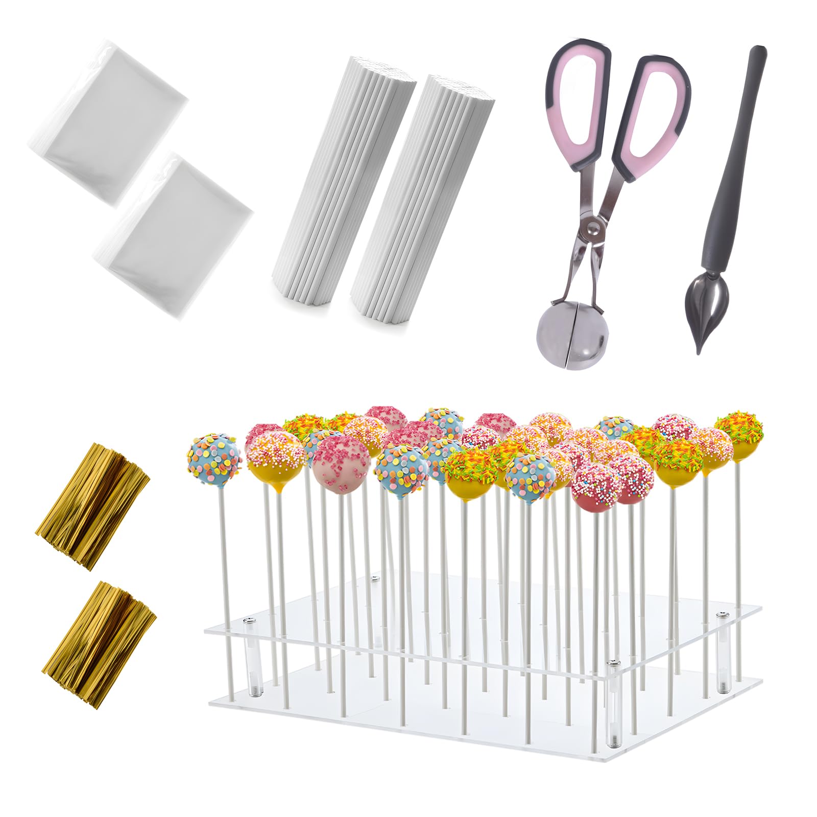 Cake Pop Kit Including 200 pcs 6 inch Lollipop Sticks and 200 Clear Wrappers, 35 Hole Clear Acrylic Display Stand, Metal Baller Scoop, Culinary Decorating Scooper, 200 pcsTwist Ties