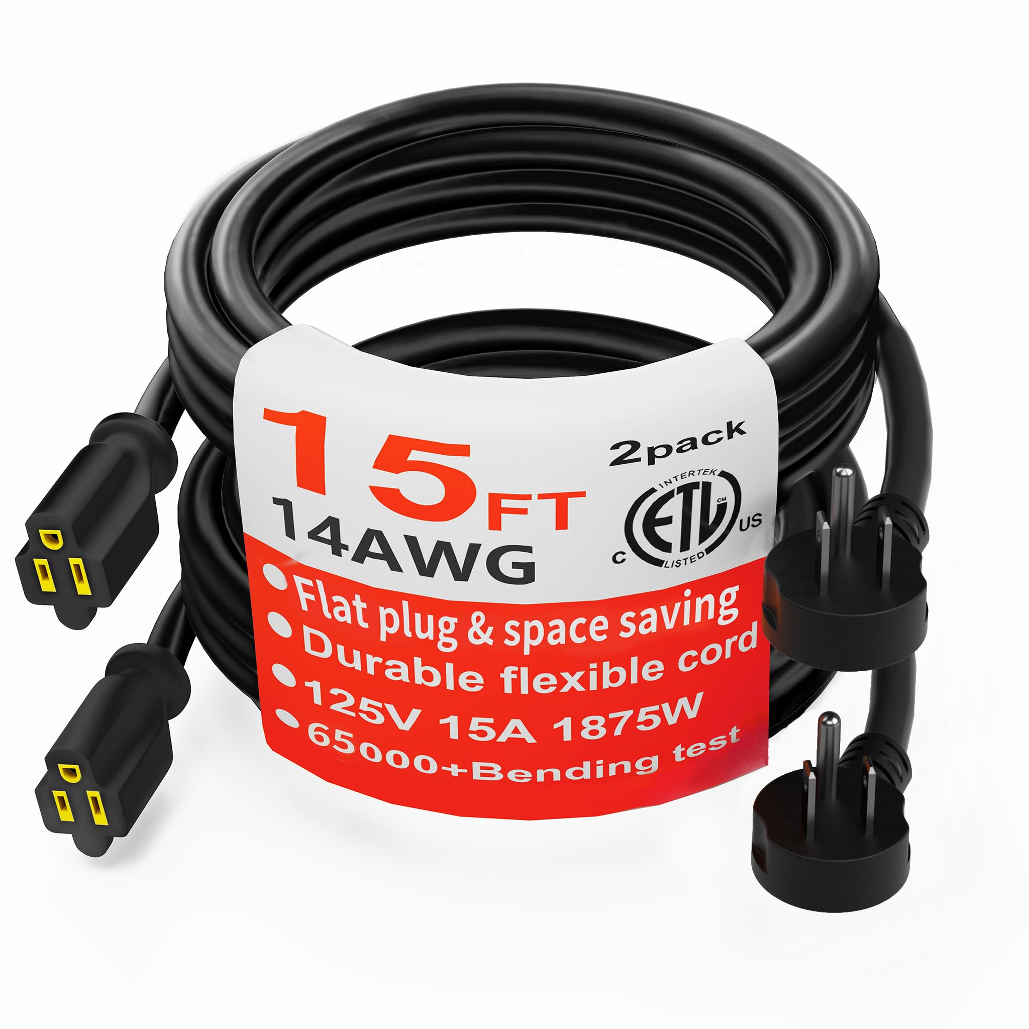 What You Get: A outdoor flat extension cord 15 foot 2pack; 15Amp 125Volt 1875 Watts, SJTW, ETL Listed