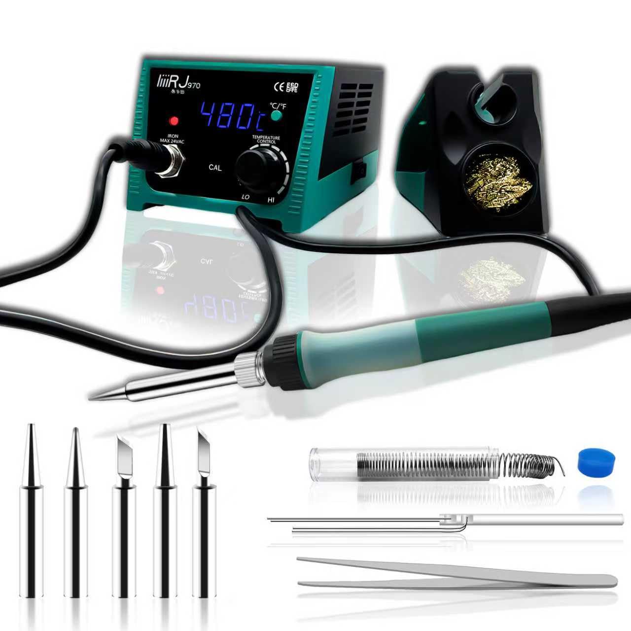 The RJ970 Digital Soldering Station is a versatile and reliable tool for electronics repair, circuit assembly, and DIY soldering tasks. Equipped with a powerful 75W output and a high-efficiency ceramic heating element, it heats from 392°F to 896°F in seconds and maintains stable performance during continuous operation. The LED display provides real-time temperature monitoring and supports easy °C/°F conversion. This upgraded kit includes 5 replaceable iron head tips for different soldering needs, lead-free solder wire for safe and clean joints, and ESD-safe tweezers for handling delicate components. Its replaceable ceramic heating core ensures long service life and easy maintenance. The anti-scald silicone grip and ESD-safe circuit design make it both comfortable and safe to use. Perfect for electronics enthusiasts, engineers, and students, this plug-and-play soldering station offers precise control, consistent heating, and reliable performance for circuit board soldering, wire repair, and hobby projects. Powered by 110V, it’s the perfect companion for any electronics workbench or home repair setup.
