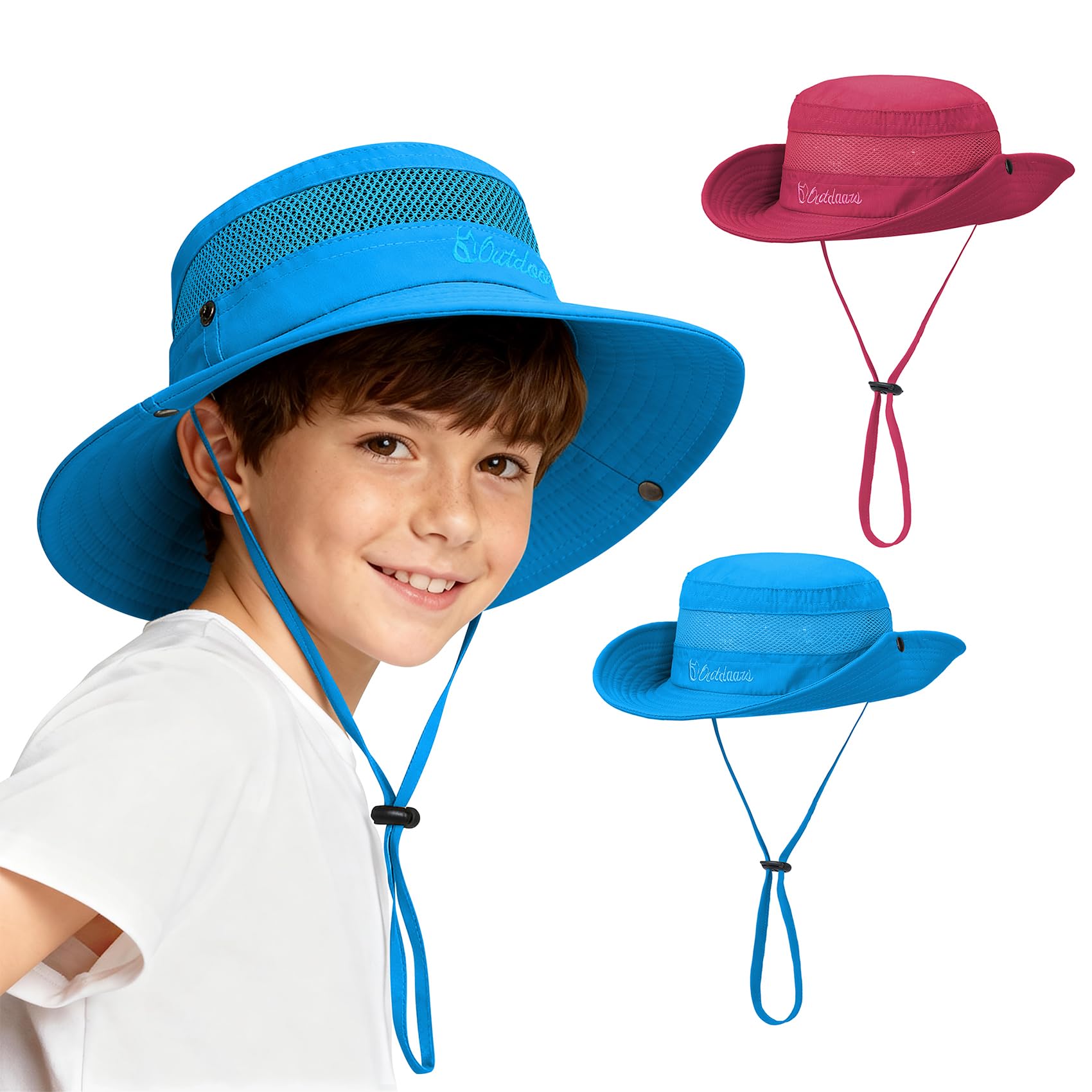 Durio 2-Pack Kids Sun Hat - UPF 50+ Wide Brim Sun Protection Bucket Hat for Boys Girls, Breathable Adjustable Outdoor Hats Sky Blue & Rose Red 5-13 Years