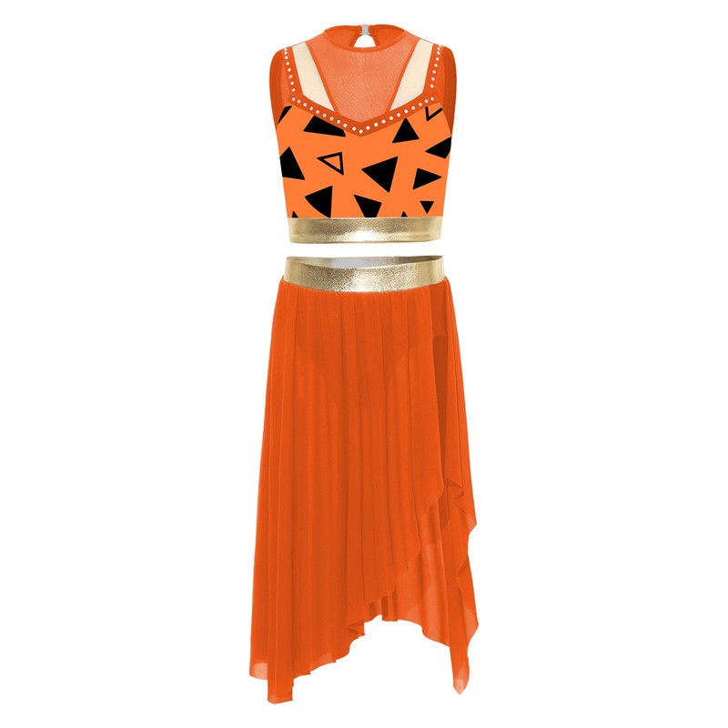 Kids Girls Costume Leotard Outfit Mesh Dancewear Stage Ruched Rhinestones Skirt