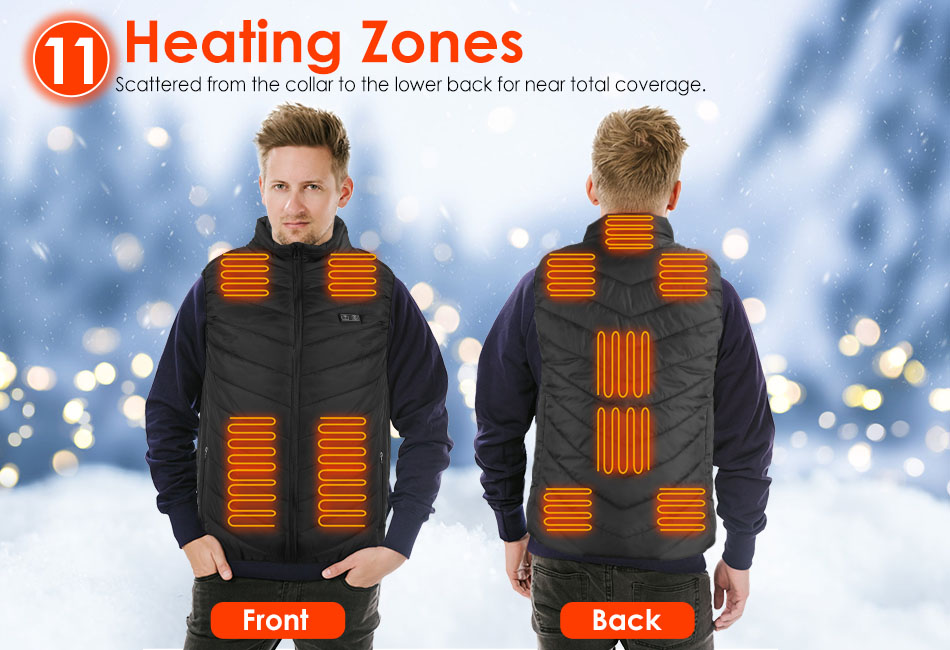 - 11 Heated Zones:This heated vest has 11 heating panels scattered from the collar to the lower back for near total coverage. Just slip the vest on to feel chill-busting warmth surrounding your body that will keep you working or playing outside even longer.