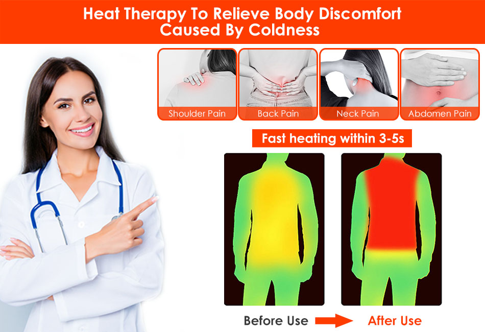 - 5 Heating Pads:Adopt 5 carbon fiber heating elements to produce heat on the left and right of the body,left and right waist and middle back. It not only warms your stomach,back,waist and abdomen,but also enhances blood circulation.