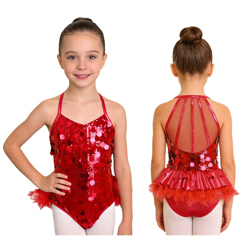 Feather and glittery sequin details bring a touch of sparkle, making the leotard stand out on the stage.