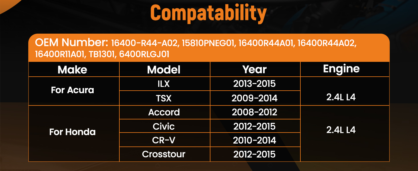 | Part Number | 16400-R44-A02, 15810PNEG01, 16400R44A01, 16400R44A02, 16400R11A01, TB1301, 6400RLGJ01, 672005, 672000 |