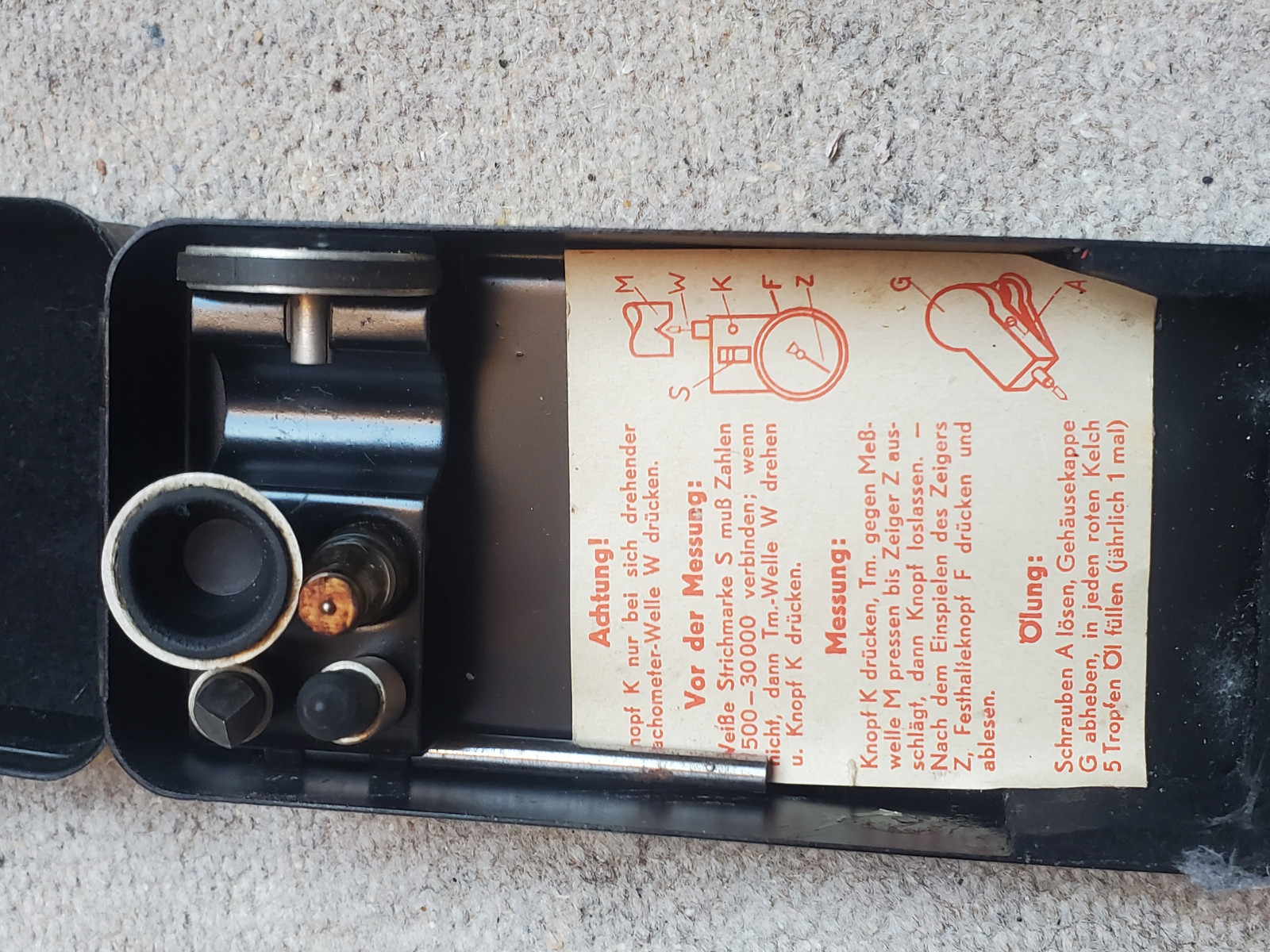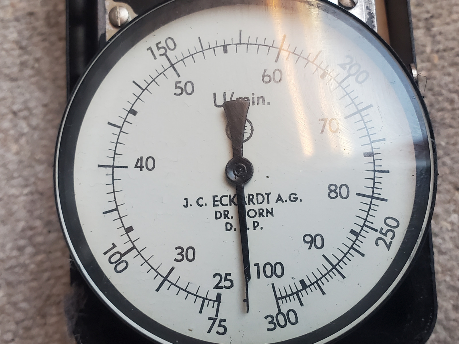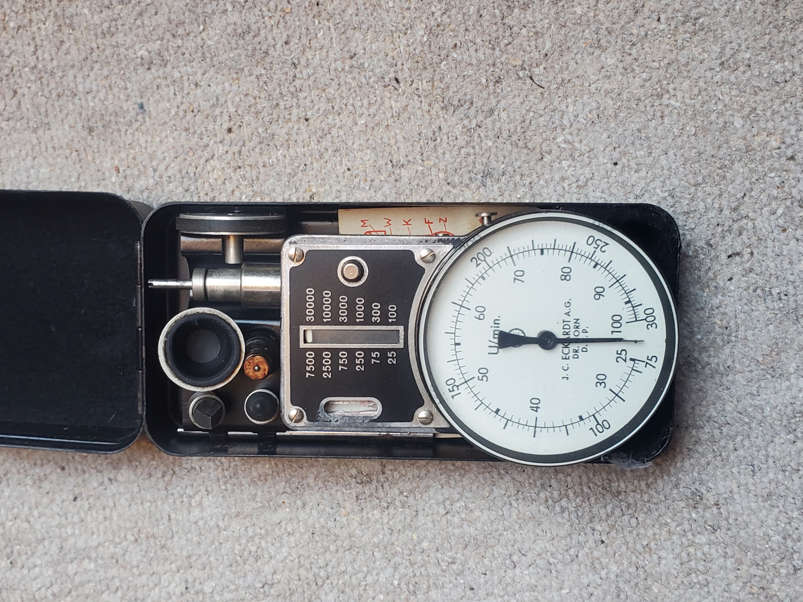 Alter Drehzahlmesser in originl Blechbox, beschriftet: "J.C. Eckard AG / DRP/ Dr. E. Horn". Maße der Box: 15cmX7cm5XcmInternational bidders are welcome.