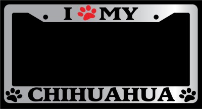 I Heart My Chihuahua (Paw) Chrome license plate frame made from high impact ABS plastic, chrome plated, and covered with color vinyl printing. - This frame is designed to last. Steel chrome frames when they get scratched will rust and rot away.