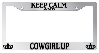 Keep Calm And Cowgirl Up Chrome license plate frame made from high impact ABS plastic, chrome plated, and covered with color vinyl printing. - This frame is designed to last. Steel chrome frames when they get scratched will rust and rot away.