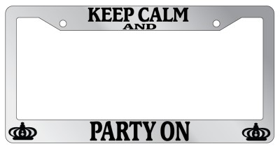 Keep Calm And Party On Chrome license plate frame made from high impact ABS plastic, chrome plated, and covered with color vinyl printing. - This frame is designed to last. Steel chrome frames when they get scratched will rust and rot away.