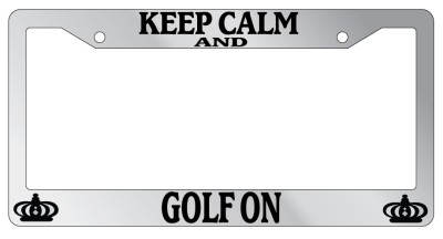 Keep Calm And Golf On Chrome license plate frame made from high impact ABS plastic, chrome plated, and covered with color vinyl printing. - This frame is designed to last. Steel chrome frames when they get scratched will rust and rot away.
