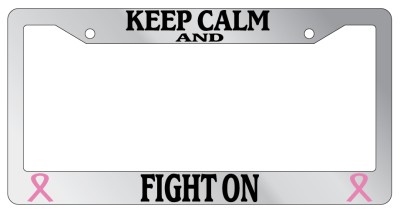 Keep Calm And Fight On Pink Ribbons Chrome license plate frame made from high impact ABS plastic, chrome plated, and covered with color vinyl printing. - This frame is designed to last. Steel chrome frames when they get scratched will rust and rot away.