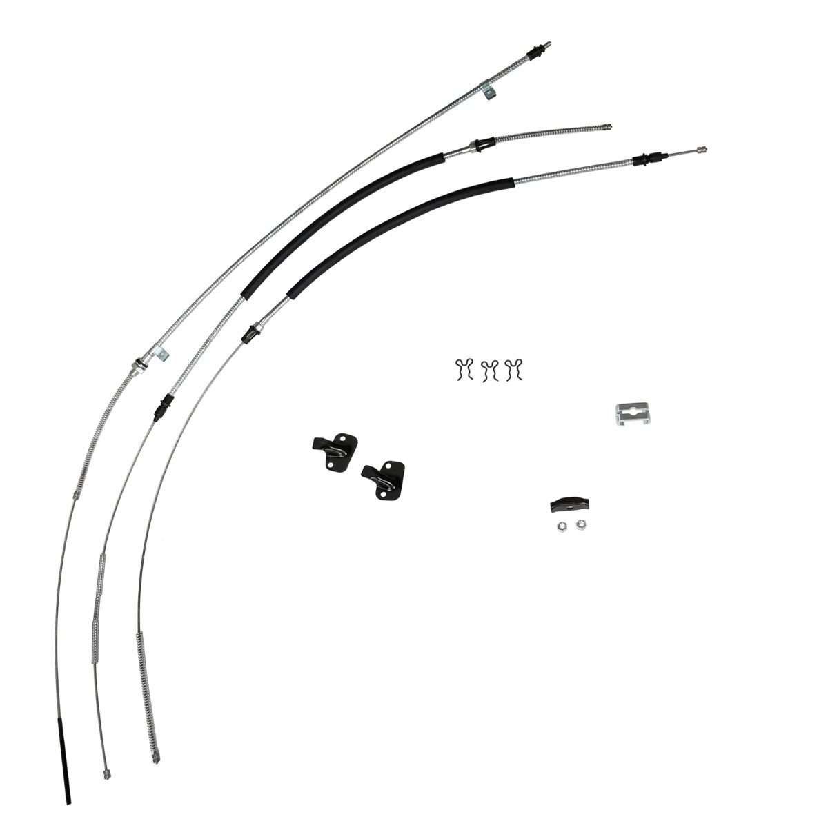 This complete parking brake cable kit replaces all the parking brake cables on your vehicle and includes the front, intermediate, and rear cables as well as all pictured hardware.