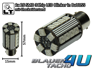 1x 26 SMD LED 3 Chip Leuchtmittel mit BaU15s PY21W Metallsockel
