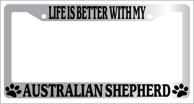 Life Is Better With My Australian Shepherd (Paws) Chrome license plate frame made from high impact ABS plastic, chrome plated, and covered with color vinyl printing. - This frame is designed to last. Steel chrome frames when they get scratched will rust and rot away.