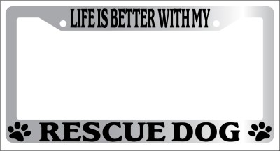 Life Is Better With My Rescue Dog (Paws) Chrome license plate frame made from high impact ABS plastic, chrome plated, and covered with color vinyl printing. - This frame is designed to last. Steel chrome frames when they get scratched will rust and rot away.