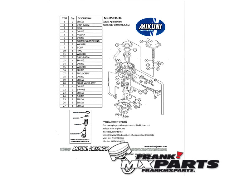 Genuine Mikuni, high quality parts. This kit contains all parts to fully rebuild the OEM carburetor. Buying these from your Suzuki dealer would cost you double...