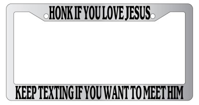 Honk If You Like Jesus, Keep Texting If You Want To Meet Him Chrome license plate frame made from high impact ABS plastic, chrome plated, and covered with color vinyl printing. - This frame is designed to last. Steel chrome frames when they get scratched will rust and rot away.