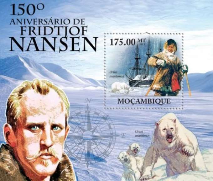 | This is a beautiful stamp souvenir sheet, issued by Mozambique in 2011, commemorating the 150th anniversary of the birth of famous Nobel Peace Prize-winning Norwegian explorer and scientist Fridtjof Nansen. The featured arctic animal shown is the Polar Bear. The sheet is Michel catalog #4493 / Bl.437, and is Post Office fresh, mint never hinged, and F/VF. Click here to visit my eBay Store for other auctions and Direct Sale items: