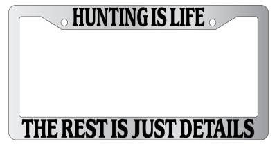 Hunting Is Life The Rest Is Just Details Chrome license plate frame made from high impact ABS plastic, chrome plated, and covered with color vinyl printing. - This frame is designed to last. Steel chrome frames when they get scratched will rust and rot away.