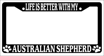 Life Is Better With My Australian Shepherd Black license plate frame made from high impact ABS plastic, covered with color vinyl printing.