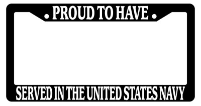 Proud To Have Served In The United States Navy Black license plate frame made from high impact ABS plastic, covered with color vinyl printing.