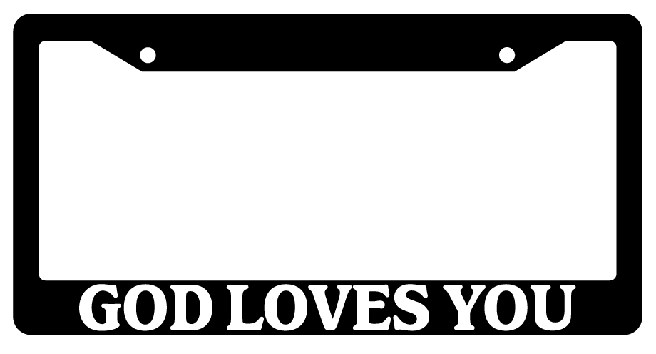 God Loves You! Black license plate frame made from high impact ABS plastic, covered with color vinyl printing.