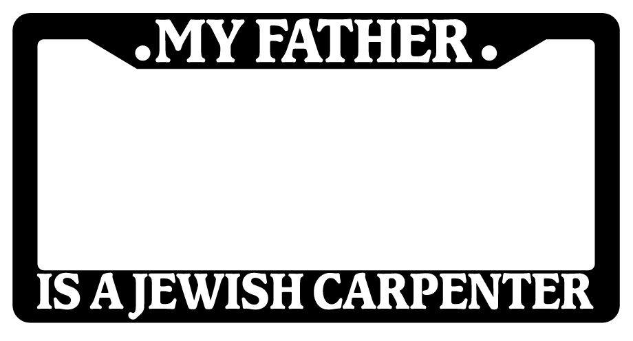 My Father Is A Jewish Carpenter Black license plate frame made from high impact ABS plastic, covered with color vinyl printing.