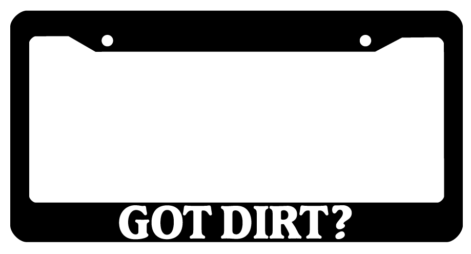 Got Dirt? Black license plate frame made from high impact ABS plastic, covered with color vinyl printing.
