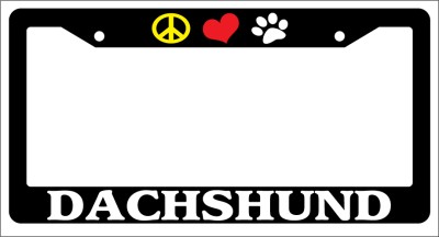 Peace love Paw Dachshund Black license plate frame made from high impact ABS plastic, covered with color vinyl printing.