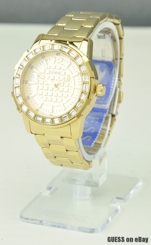 Bracelet Véritable acier inoxydable. Guess emblème à l'intérieur de la plaque. Autour autour de la façade. Un bouton-poussoir. Trois mains Pointers. Japon Mouvement Quartz. Retour en acier inoxydable. Résistant à l'eau. Spécial a fait Devinez Waterpro Regarder collections. Nouvelle collection de GUESS USA. Beaucoup de cristaux en dehors de la façade de la montre. Collections limitée. Bracellet extérieur Or. Cyrstals de couleur d'or au coeur de façade. Navire rapide superbe de Etats-Unis (si paiement par courrier).