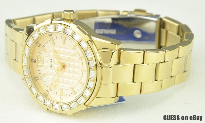 Genuine Strap Stainless Steel. Guess emblem inside the plate. Round around the faceplate. One-push button. Three hands Pointers. Japan Quartz Movement. Stainless Steel Back. Water Resistant. Special Made Guess Waterpro Watch Collections. New Collection from GUESS USA. Lots of crystals outside of the watch faceplate. Limited Collections only. Gold outer bracellet. Cyrstals with Gold color inside faceplate. Ship Super FAST from USA (If pay with EXPRESS MAIL).