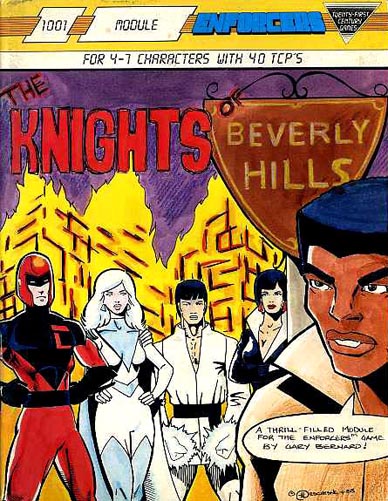 For sale is the Enforcers superhero gaming adventure module The Knights of Beverly Hills. It was produced by Twenty-First Century Games in 1988 and features 32 pages of high-powered adventure - See the 2nd photo provided for a detailed description. Condition is Excellent/FINE+: strong color and binding, light cover wear with a light bend to the module, actual pictures shown, free of pen/pencil markings; pages clean, neat & complete!