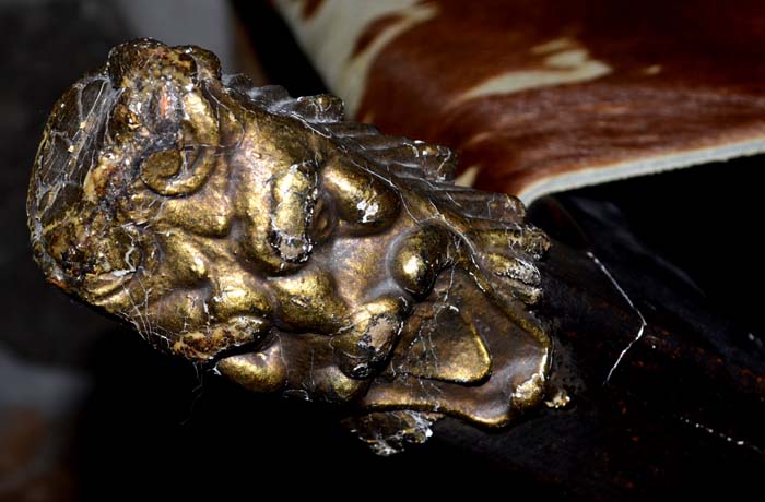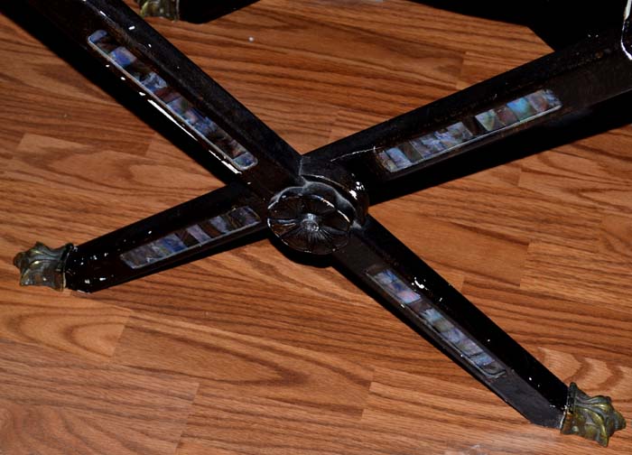 ...and a lovely gold scroll like design on the sides and the feet and Lion heads on the top. A very unique one of a kind prop! This has gorgeous mother of pearl on the legs...