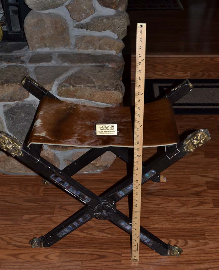 GOOD LUCK on this Famous Xena Warrior Princess COLLECTION...a GREAT piece of American TV Show history that you will rarely find in the marketplace.....A GREAT INVESTMENT for BOTH Movie Prop & Movie collectors! Movie Costume & Props are becoming one of the fastest growing assets in the world. This Rare GREAT "Xena" Prop and Lucy Lawless Original Autograph are IN SCREEN USED but overall good condition! They are very well crafted piece & and ready to display in your media room, office, or museum... The chair is missing one of the gold feet at the bottom. It has some screen used wear but overall no stains or rips. The chair also folds up, but would not be recommeded to be used for regular sitting.