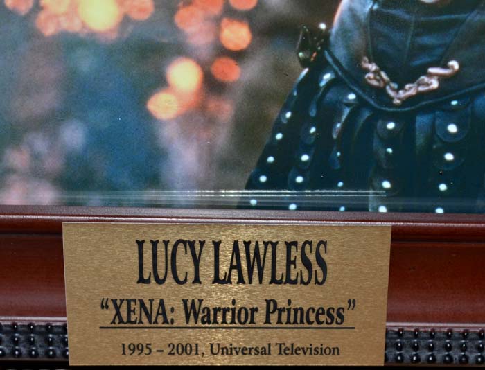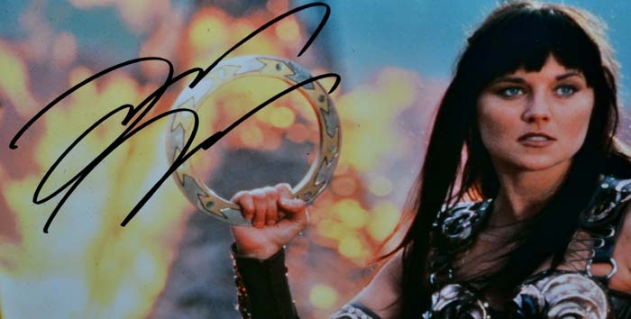 Lucy Lawless's Original Autograph shows her as Xena Warrior Princess. She signed in black ink.