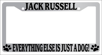 Jack Russell Everything Else Is Just A Dog! Chrome license plate frame made from high impact ABS plastic, chrome plated, and covered with color vinyl printing. - This frame is designed to last. Steel chrome frames when they get scratched will rust and rot away.