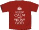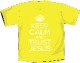"Keep Calm And Trust Jesus" Short sleeve shirt 100% cottonAvailable in sizes S-2XL (please be sure to indicate the size at the top of the page)Available on Yellow, Red, Navy, Orange, Kelly, Brown And Black