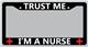Be Nice To Me I May Be Your Nurse Someday Black license plate frame made from high impact ABS plastic, covered with color vinyl printing.
