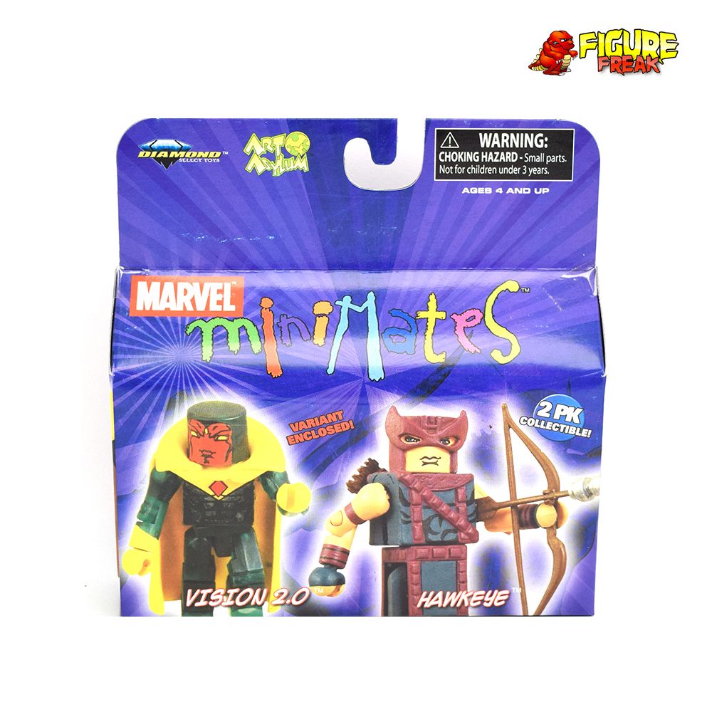 From Marvel Minimates Series 20... minty fresh sealed Vision 2.0 Variant & Hawkeye 2-pack. A Diamond Select Release! An Art Asylum Design & Sculpt! You asked for it! Featuring a lineup that promises to send fans into the stratosphere, the unstoppable Marvel Minimates line continues with this landmark twentieth series. Each two-pack features a knock-out combination of characters - including Smart Hulk & Abomination, Havok & Polaris, Hawkeye & Vision and the limited Vision 2.0 variant Minimate! These two-inch champions pack quite the punch and promise to defend your collection from supervillains, aliens and demons alike!