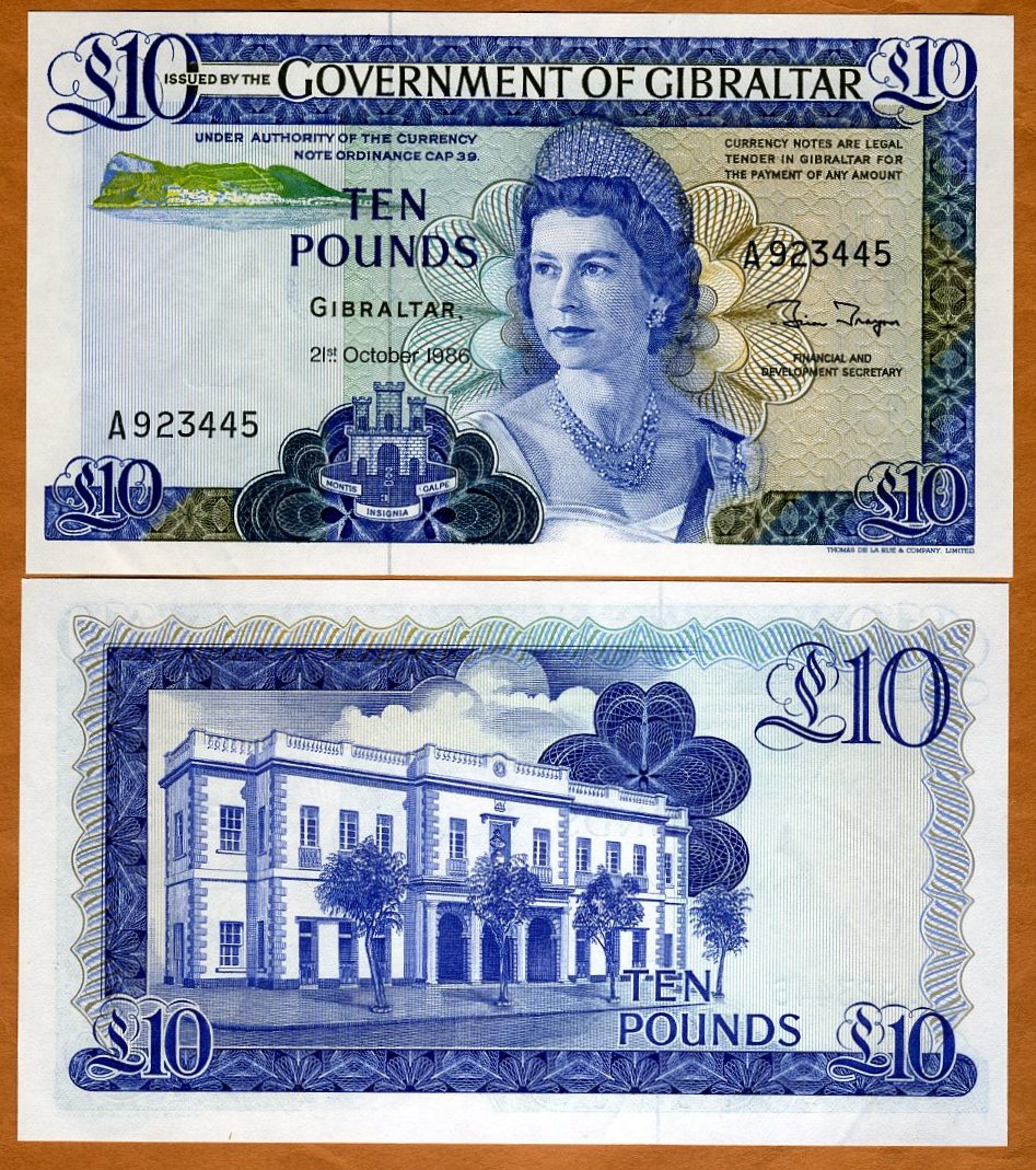 As in the £1 and £5 bank notes, the design features the rock, castle and key of the Gibraltar crest plus Queen Elizabeth II on the front and an image of the the House of Assembly, Gibraltar's parliament, which is the main building of the Piazza area of Main Street in Gibraltar.