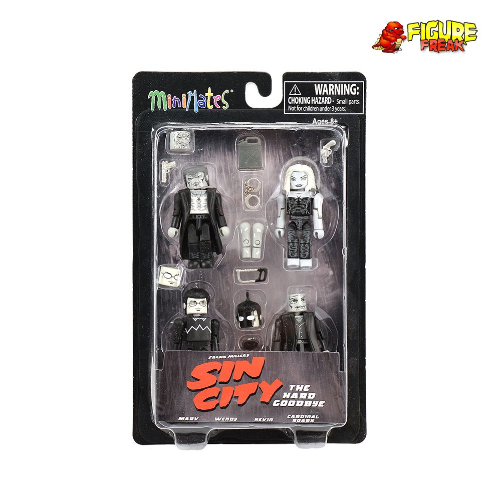 From the Sin City Minimates Collection... minty fresh sealed Series 2 "The Hard Goodbye" Box Set. A Diamond Select Toys release! They killed Goldie. And now they're gonna pay. Marv barrels his way into the Sin City movie line, with a four-pack of Minimates based entirely on his storyline, "The Hard Goodbye"! With Marv, Wendy, Kevin and Cardinal Roark in one box set, this is guaranteed to be one of the most hard-boiled Minimates sets ever made! Each Minimates mini-figure stands 2 inches tall and features a variety of interchangeable parts, weapons and accessories. Comes packaged on a full-color blister card. Designed by Art Asylum!