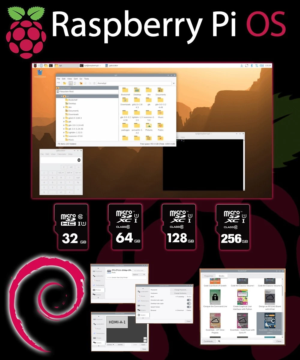 32GB / 64GB / 128GB / 256GB Class 10 Micro SD with Full Size SD Adapter PreLoaded with Raspberry Pi OS