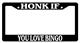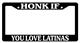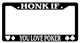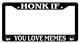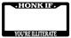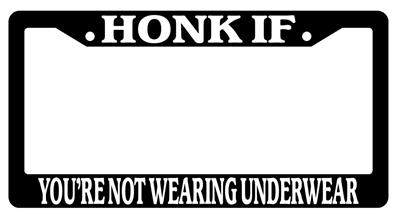 Black license plate frame HONK IF YOU'RE NOT WEARING UNDERWEAR made from high impact ABS plastic, covered with color vinyl printing.
