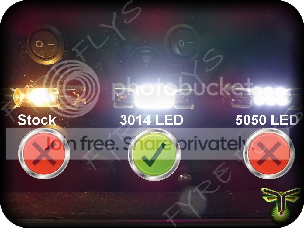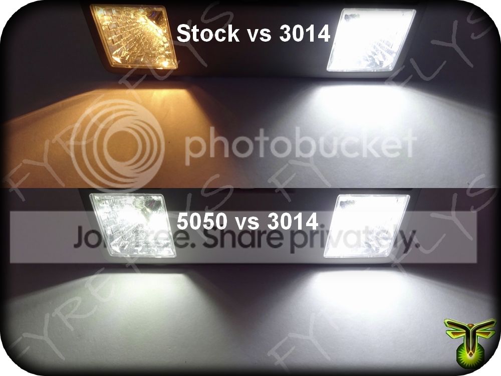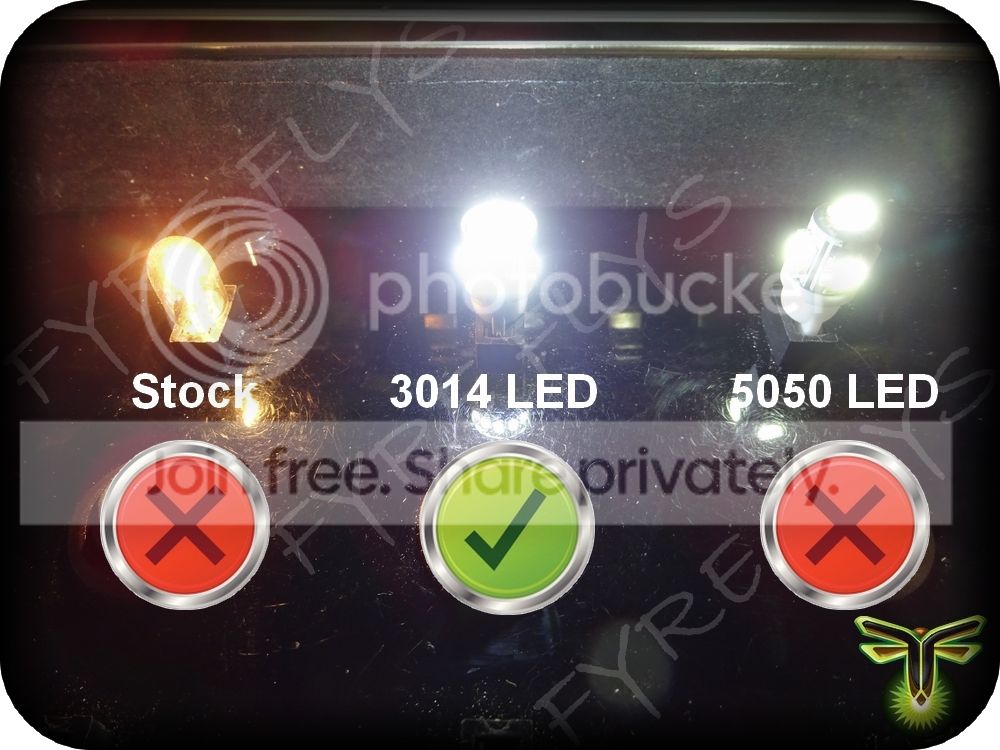 Products Fyre Flys 3014 Series LED bulb packages are much brighter than typical 5050 LED interior packages. 3-5 times brighter on average. See For Yourself Check out the comparison photos. We compare our 3014 series LEDs to the competition's 5050 LEDs and stock bulbs. You will love the results in your vehicle. |