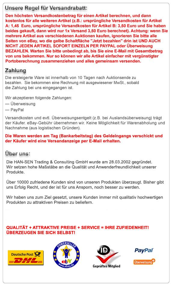 • Versand per Deutsche Post innerhalb von 24 Stunden nach Zahlungseingang (außer Feiertage und Betriebsferien)