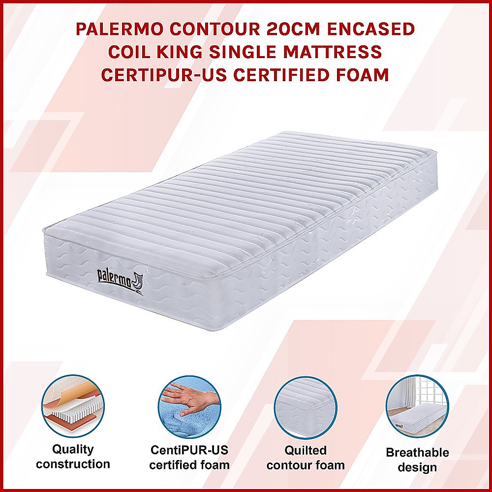 Sleep in comfort with the Palermo King Single Contour 20cm Mattress, designed with CertiPUR-US® certified foam and 7.5" (19cm) 14-gauge pocket springs for lasting support. The individually encased coils contour to your body for even weight distribution and pressure relief, while the quilted foam layers on top and bottom provide a soft, cushioned feel that reduces coil sensation.