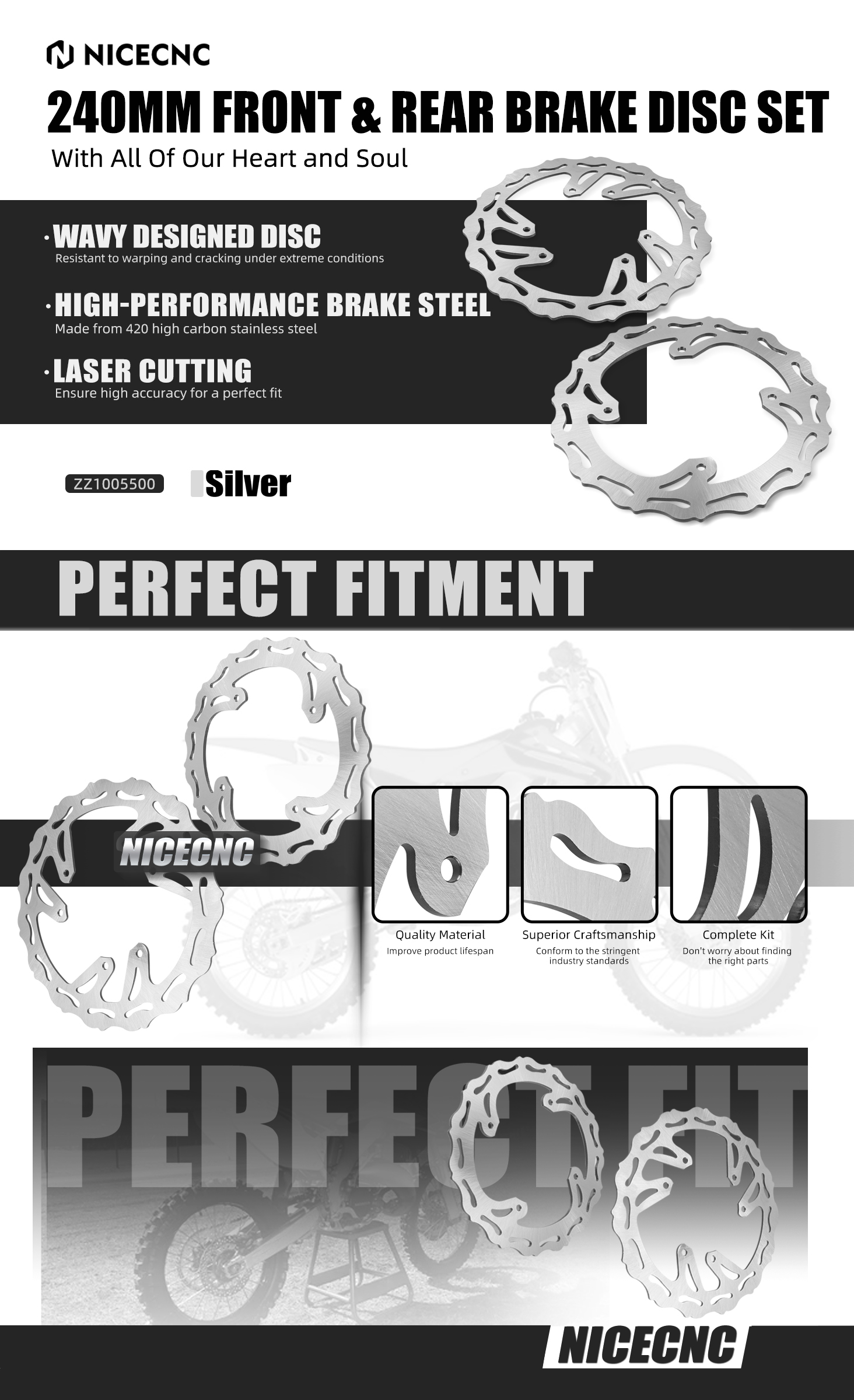 The Brake Disc Rotors are made from a 420 high carbon stainless steel with the best manufacturing process. Wavy designed outer disc shape to help keep brake pads clean and dissipate heat, provides outstanding braking performance and minimum pad wear.