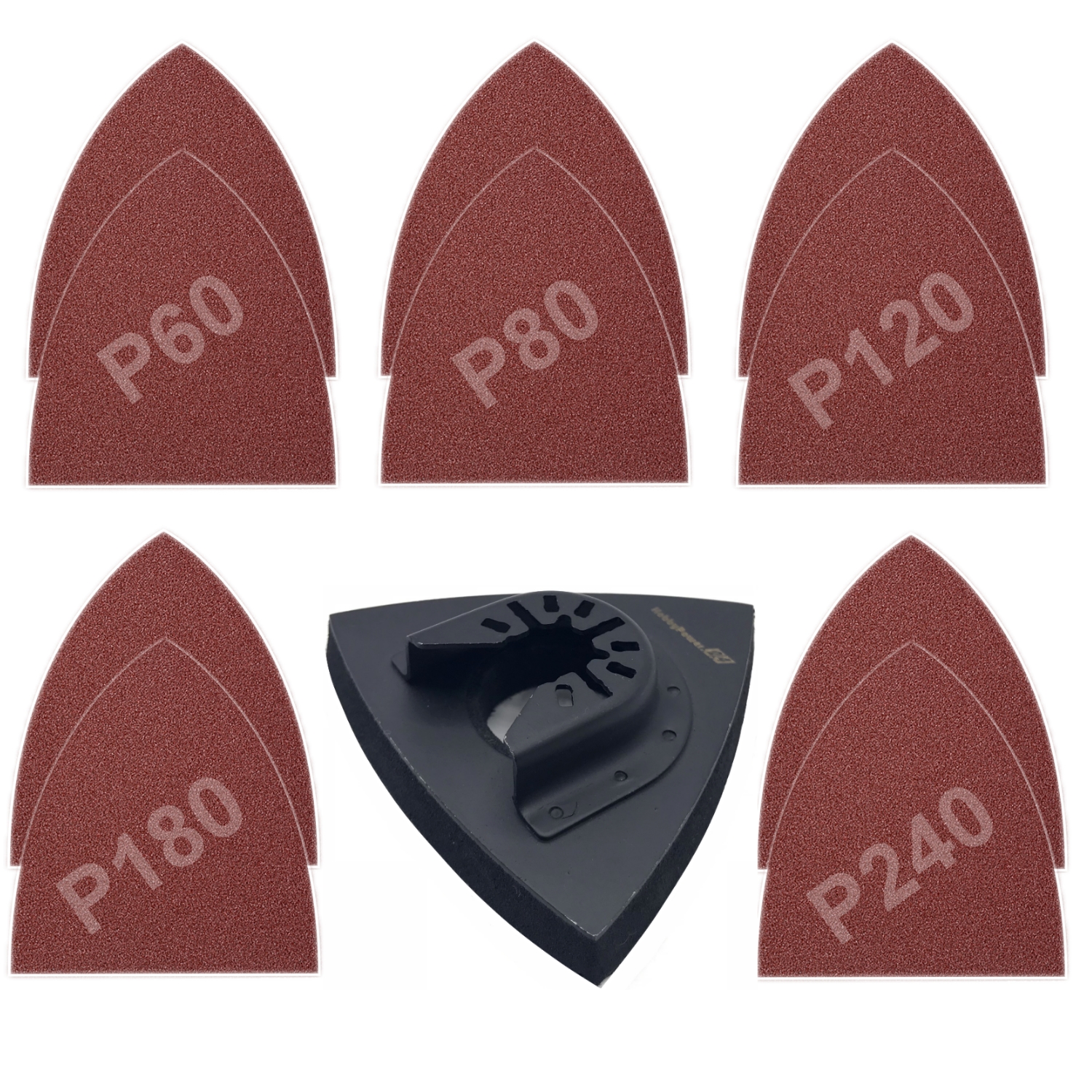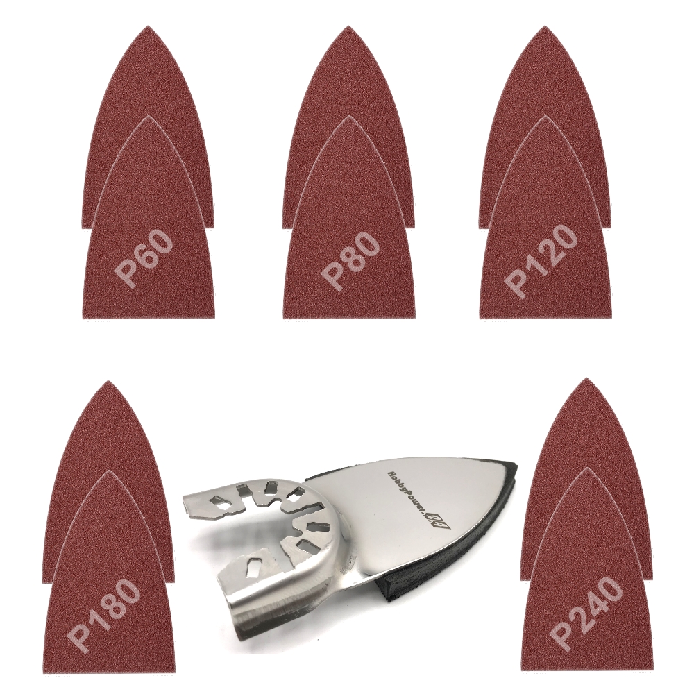 1x Schleifplatte klein Klett 53x53x37mm + 10x Schleifpapier 2xP60 2xP80 2xP120 2xP180 2xP240