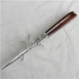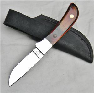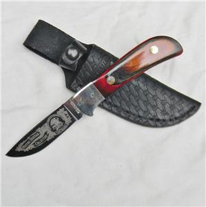 Highly-detailed deep etching on the blade; burnt laminated wood handle scales; silver nickel bolsters. The knife and black leather sheath are in excellent overall condition: original edge, the tip is intact. The knife is about 8-1/8" / 20.5 cm overall; the blade is about 3-1/2" / 9 cm. Very handy mid-size Hunter with a razor-sharp blade. It is as beautiful as it is practical; excellent knife for almost any hunting task.